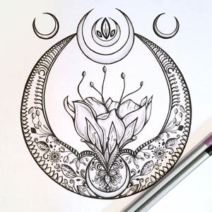 Adult Kids Coloring Page Crescent Moon Original Lotus Flower Etsy Canada